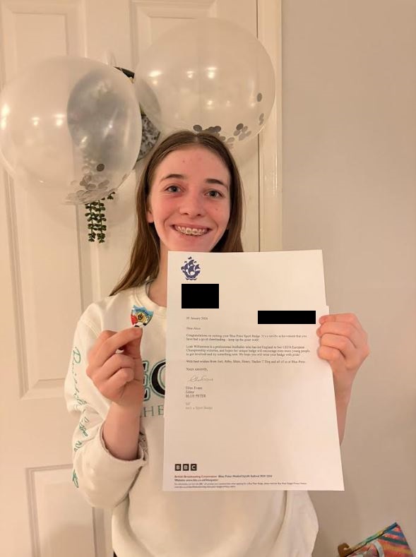 Huge congratulations to Alice, who has earned her Blue Peter Sport Badge for cheerleading. The badge recognises young people who challenge themselves and try new sports.